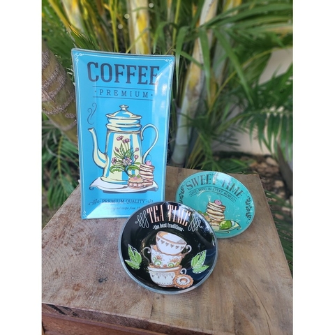Conjunto com duas petisqueira redondas e uma retangular em vidro.